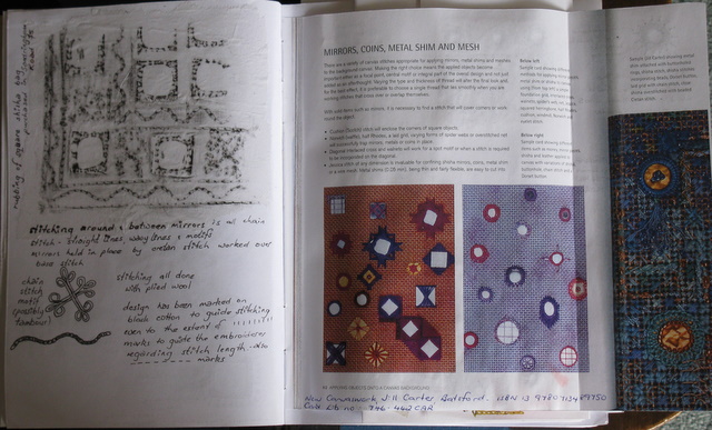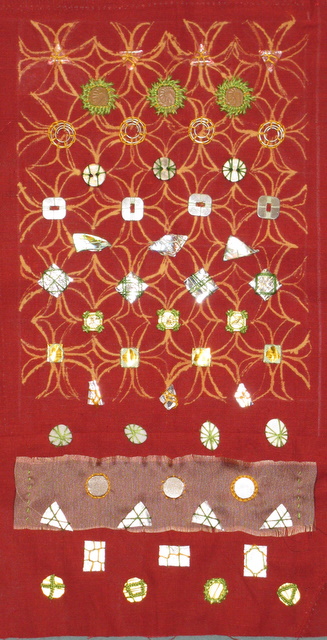 Small bag with square mirrors stitched in wool on a cotton ground. I am guessing that this