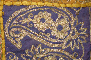 Cushion assembled from old metal embroidered saris. The cushion is 42