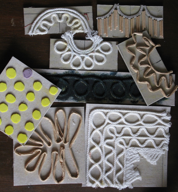 Stamps made from foam, string, paper string and card and broken satay